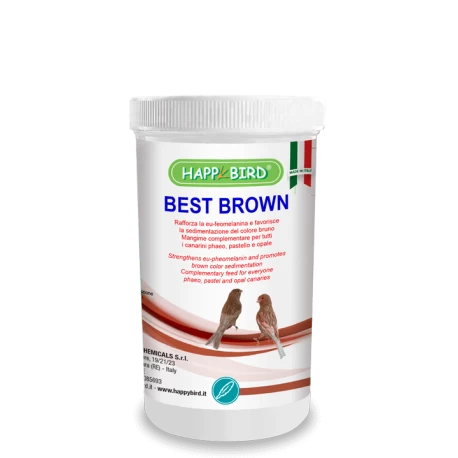 Best Brown intensifie la couleur brune (eu-feomelanine) présente dans le plumage des canaris feo, pastelle et opale. Intensifie la couleur brune dans le plumage.
