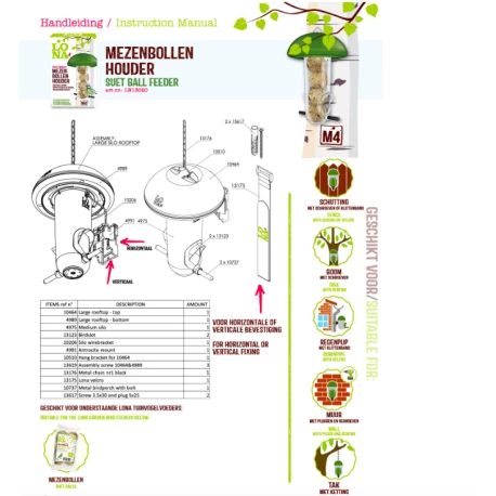 LONA M4 est un silo d’alimentation pour oiseaux avec 2 entrées d’alimentation. Pour les petits oiseaux de jardin comme les mésanges, les pinsons, les moineaux et les espèces similaires. Facile à fixer à un piquet, tronc d’arbre, clôture, mur ou pergola. Idéal pour administrer des boules de graisse aux oiseaux sauvages.